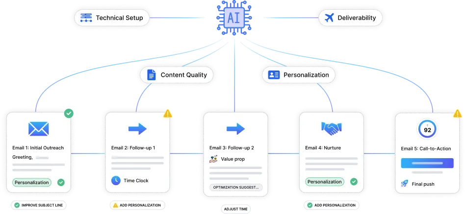 Evaluates merge tags, spintax usage, and even subject line personalization. Personalized sequences actively help achieve higher open rates and reply rates than generic ones.